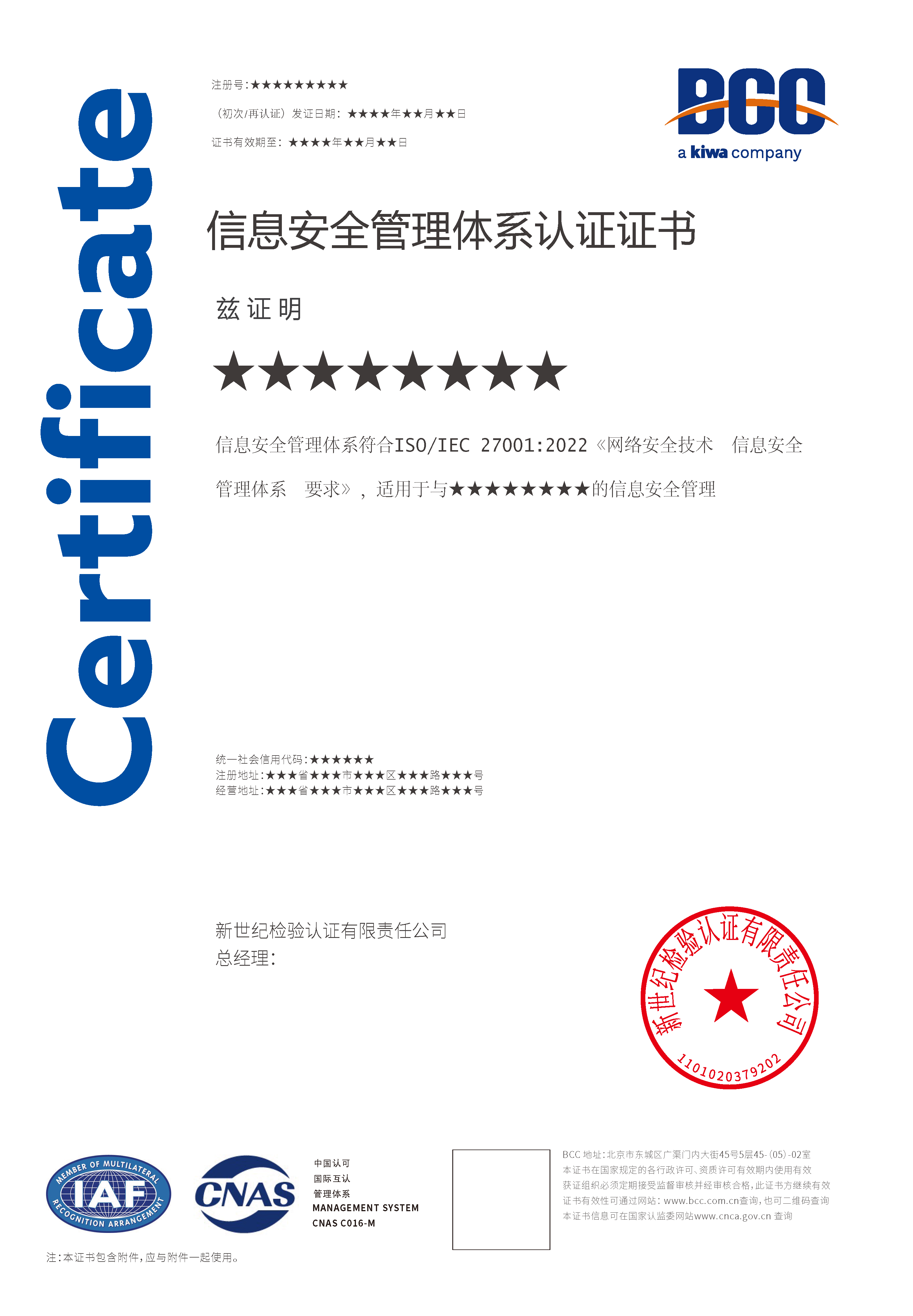 本頁涉及的認(rèn)證服務(wù)中均有對應(yīng)的《認(rèn)證實(shí)施規(guī)則》,BCC擁有其最終解釋權(quán)。任何組織及個(gè)人未經(jīng)BCC許可,不得以任何形式全部或部分使用(法律要求除外)認(rèn)證相關(guān)信息。如需獲取相關(guān)實(shí)施規(guī)則請用以下方式聯(lián)系獲?。弘娫挘?10-58579316 郵箱:fwjs@kiwa.cn